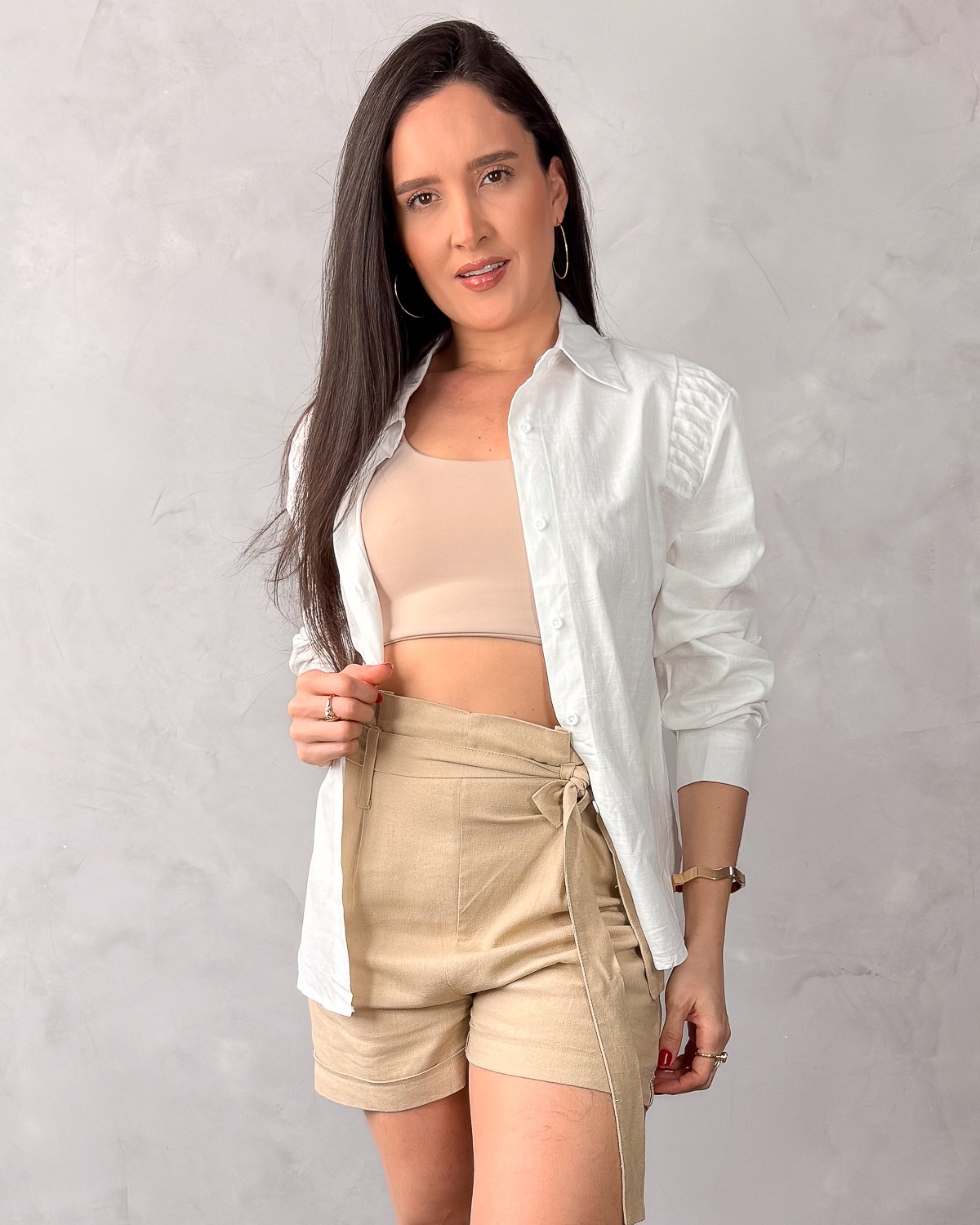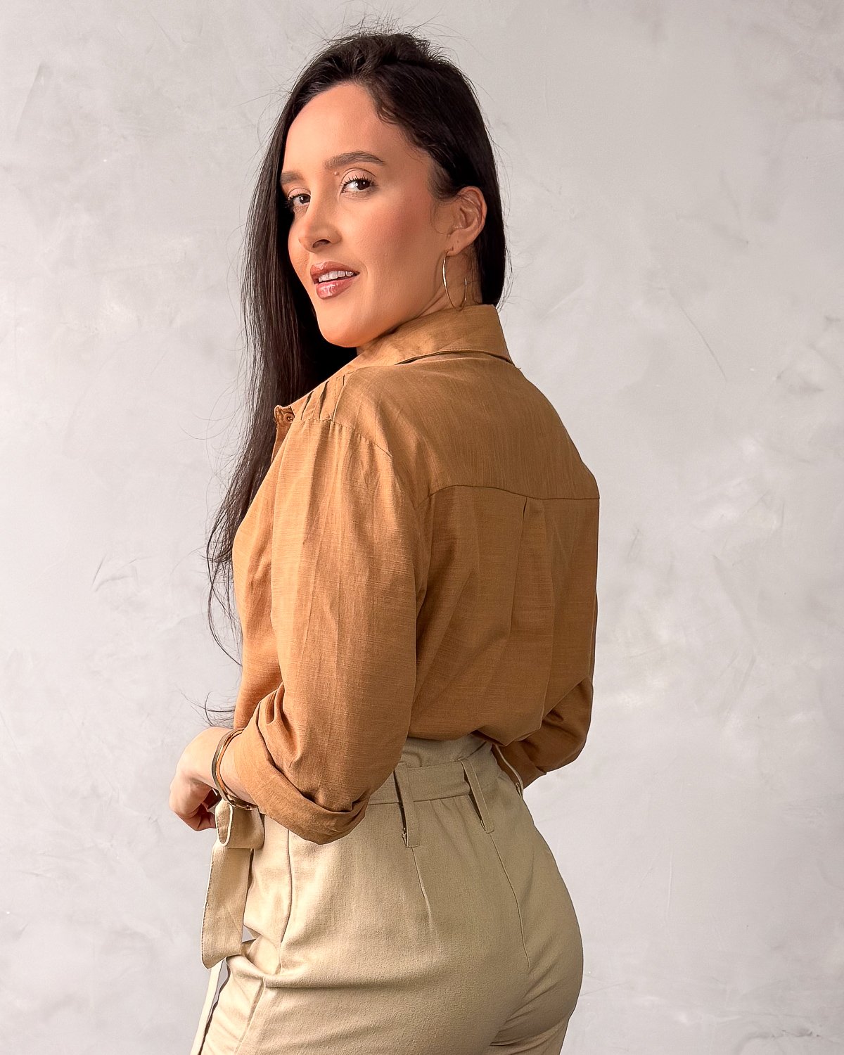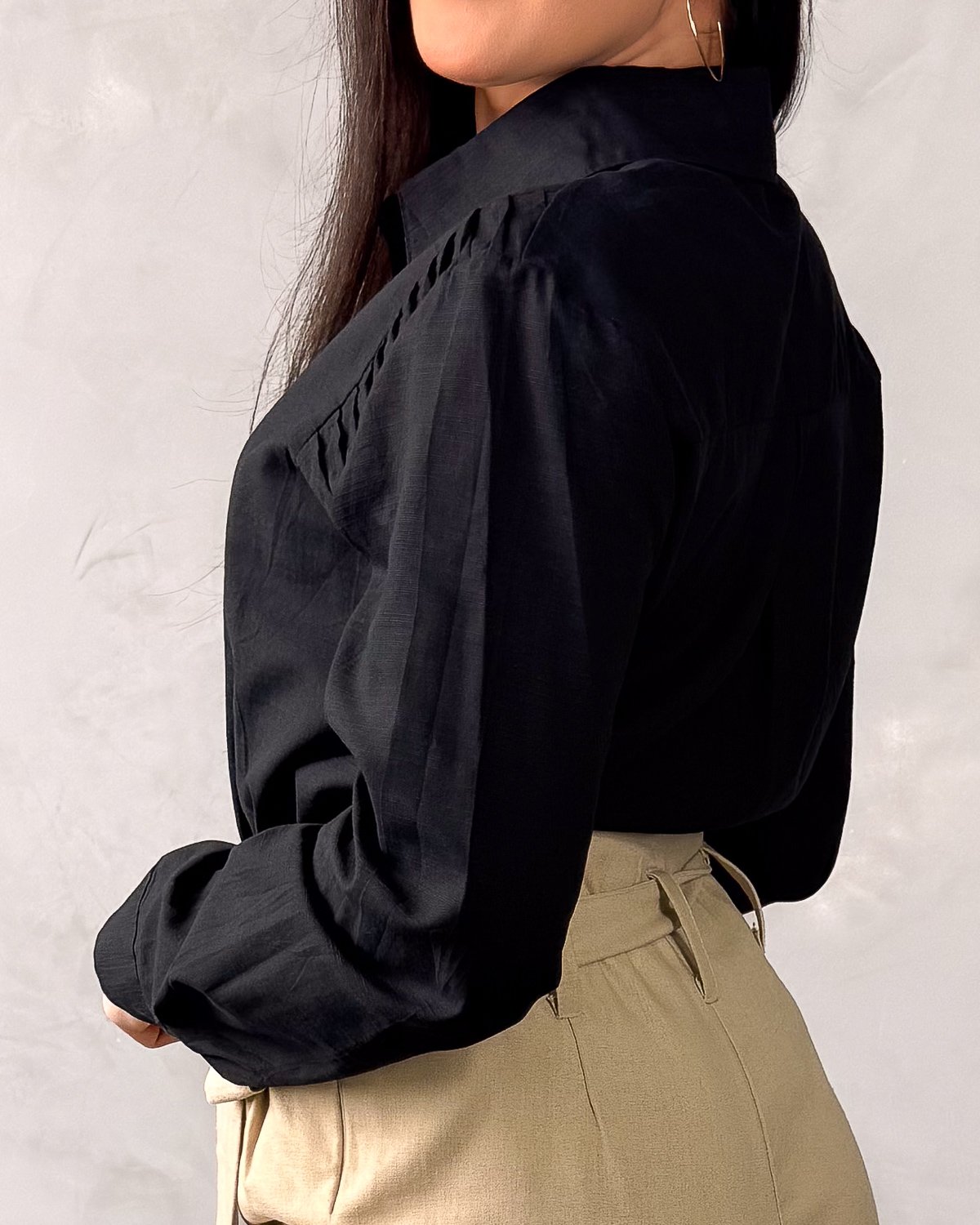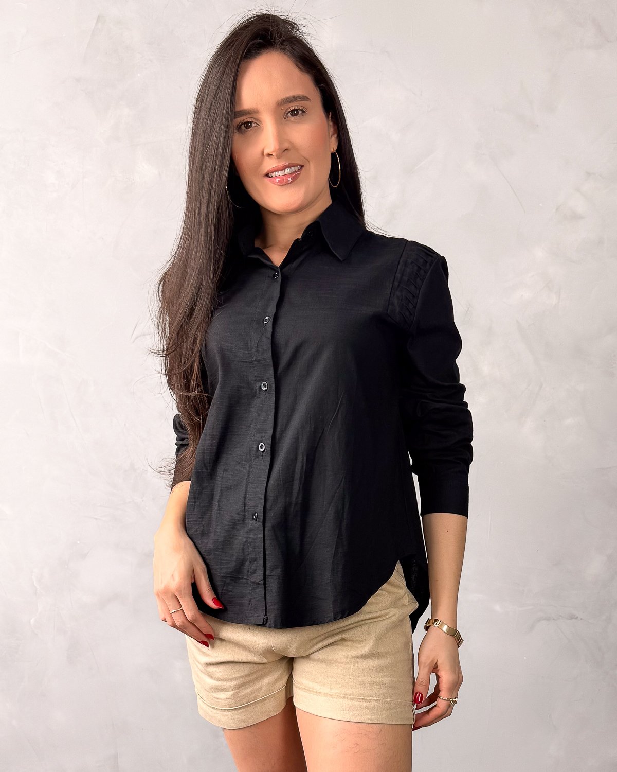 O detalhe de pregas nos ombros adiciona um charme sutil e feminino, elevando o visual clássico da camisa tradicional.