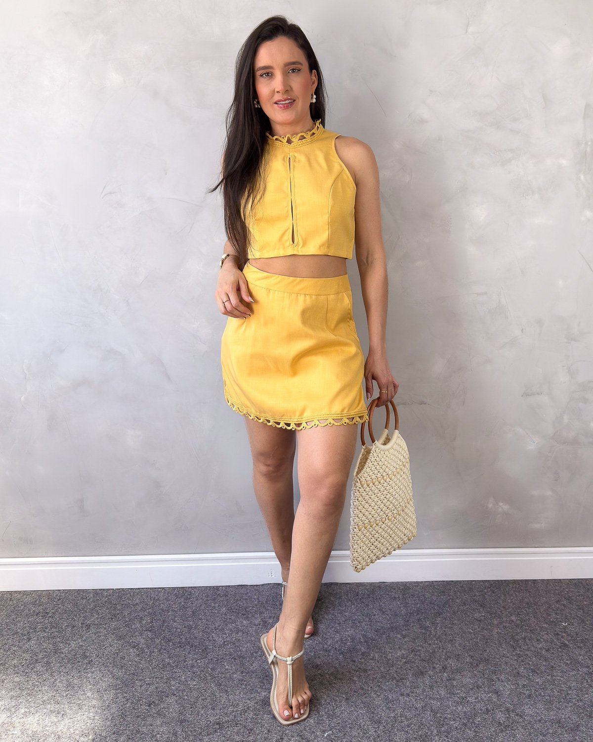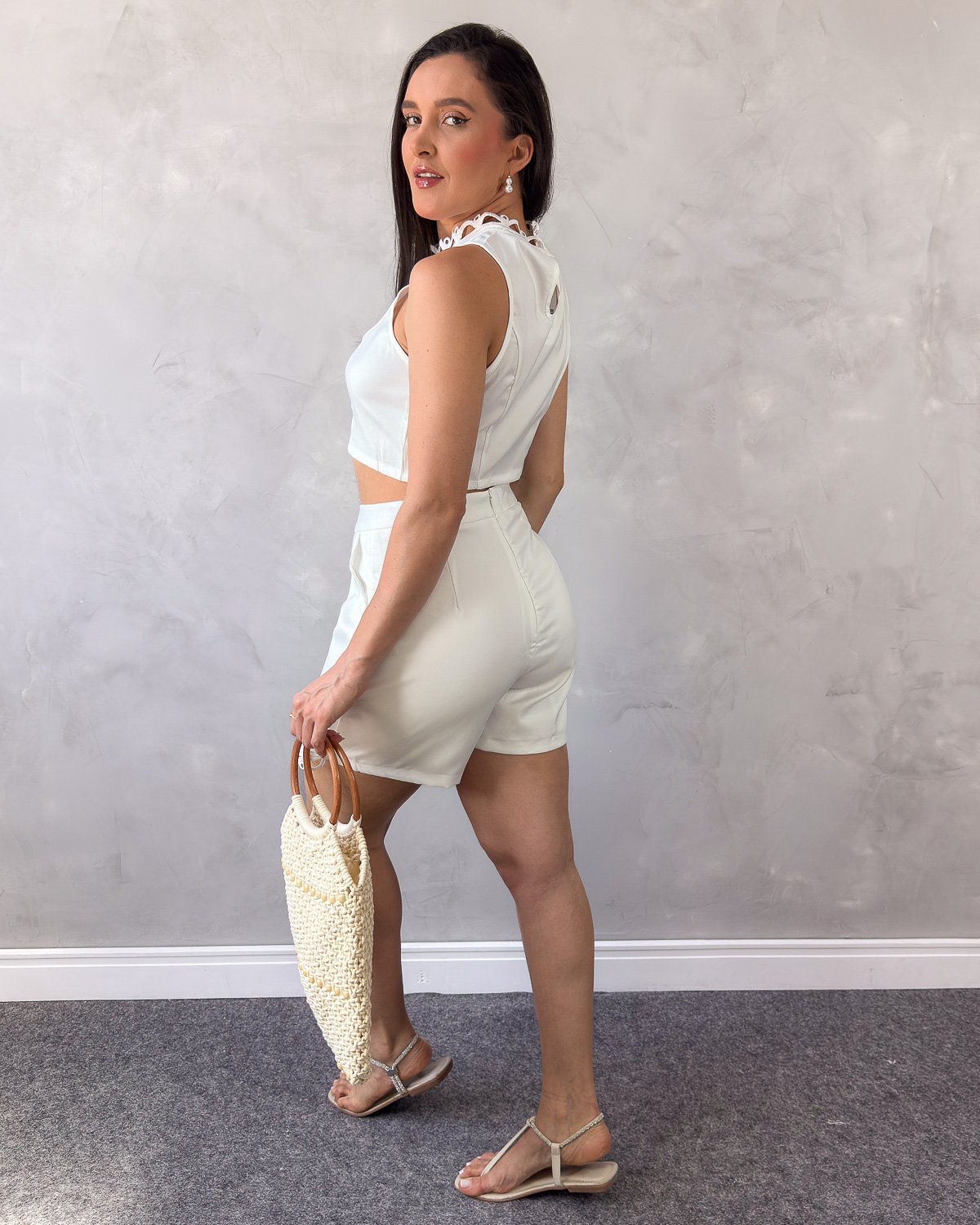 Delicado e sofisticado, este conjunto traz frescor e modernidade para os seus looks. O cropped estruturado com gola alta e detalhe em guipir adiciona um toque romântico e elegante, enquanto o short saia garante praticidade e estilo, com acabamento especial na barra também em guipir.