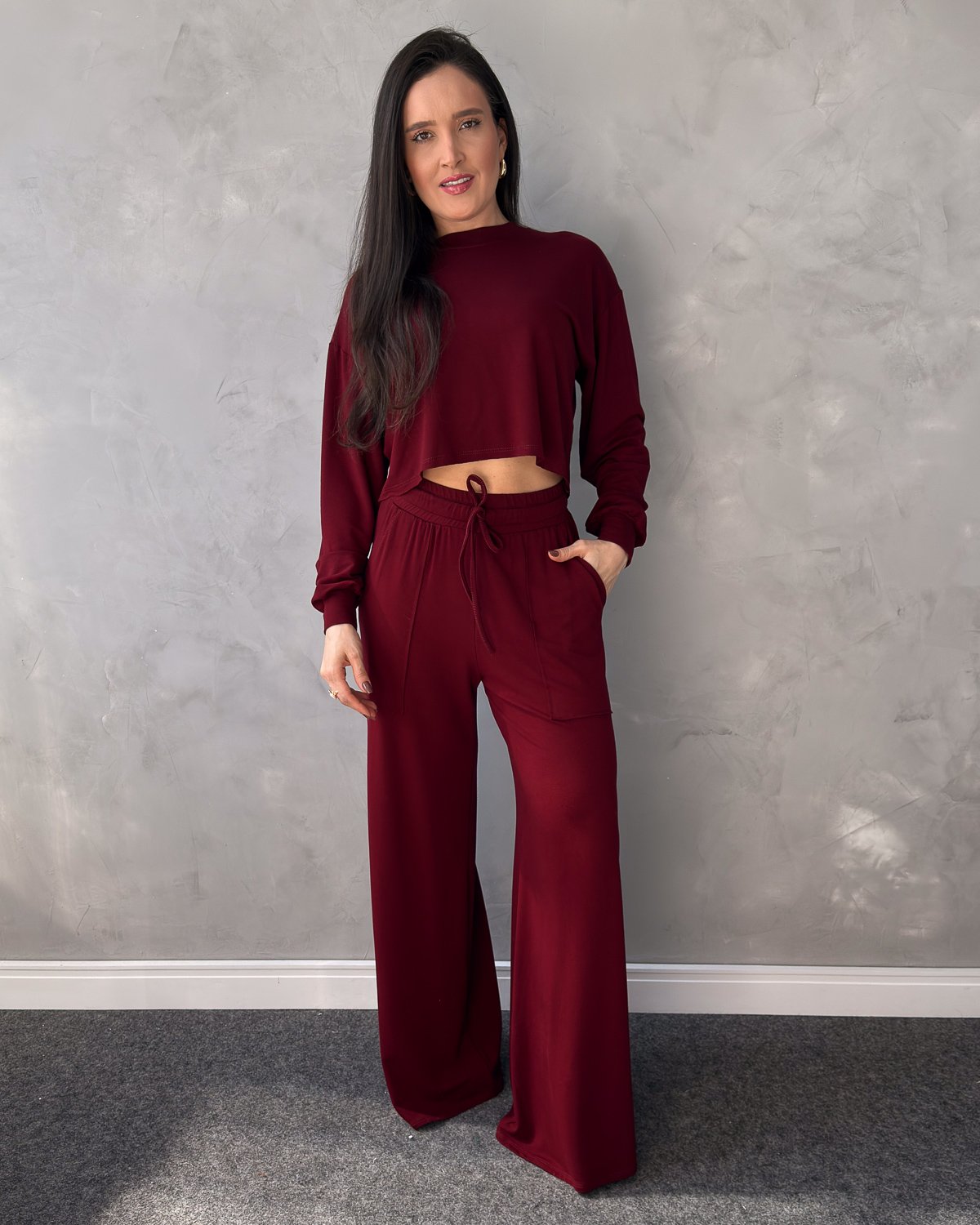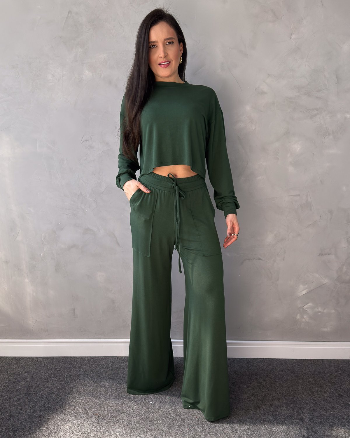 O Conjunto em Moletinho com Cropped e Calça Pantalona é a escolha ideal para quem valoriza conforto com estilo. O cropped possui modelagem soltinha, gola redonda e mangas longas, trazendo um visual moderno e descontraído. A calça pantalona tem cós com elástico e amarração, além de bolsos utilitários que complementam o design prático e despojado. Perfeito para o dia a dia, home office, viagens ou aquele passeio casual com toque fashion.
