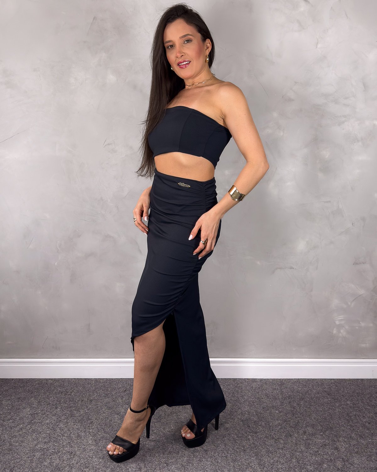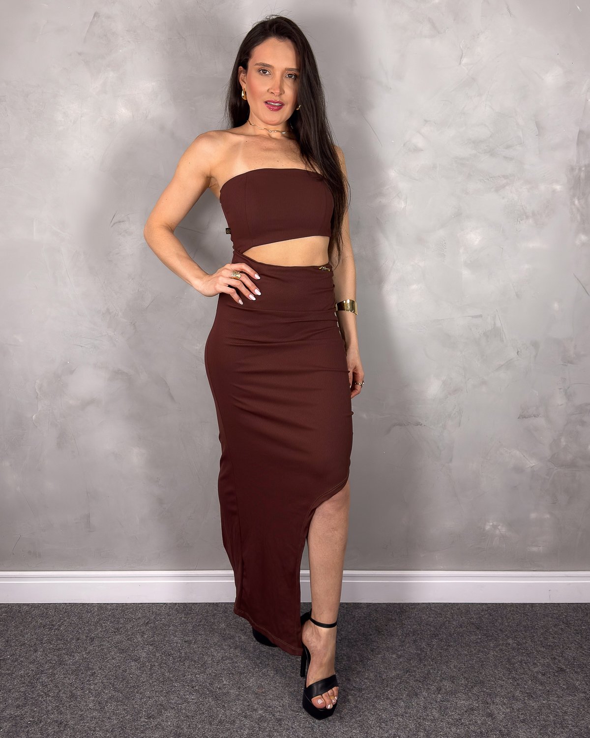 Um vestido que exala sensualidade e atitude! Feito em poliamida canelada com toque macio e elasticidade perfeita, ele se ajusta ao corpo valorizando cada curva. O recorte frontal moderno e a fenda lateral deixam a produção ainda mais ousada e poderosa. O busto tipo tomara que caia completa o visual com sofisticação.